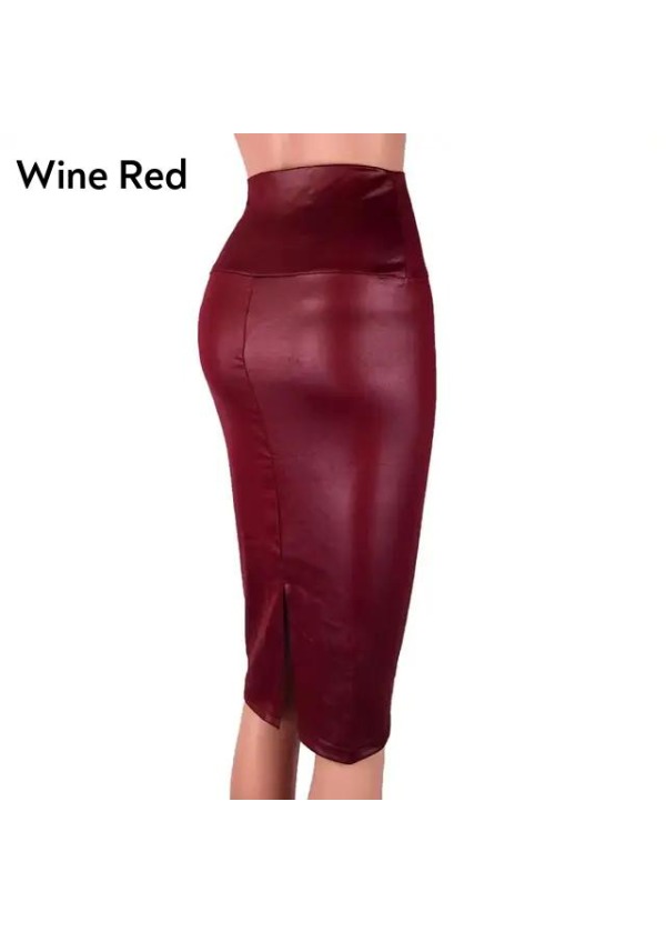 Fashion Women High Waist Split Faux Leather Knee Length Bodycon Pencil Skirt